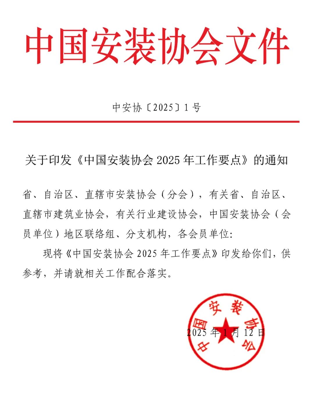 指导思想:坚持以习近平新时代中国特色社会主义思想为指导,全面贯彻党的二十大和二十届二中、三中全会精神,贯彻落实中央经济工作会议和全国住房城乡建设工作会议精神,坚持党建引领,坚持“大安装”工作思路,认真履行“服务国家、服务社会、服务群众、服务行业”职责使命,围绕住房城乡建设工作重点,推动行业科技创新,促进工程质量水平和从业人员综合素质提升,努力推进安装行业高质量发展。1. 聚焦市场形势和行业发展趋势,结合会员单位需求,开展有针对性的课题调研,及时准确反映会员单位诉求,充分发挥桥梁纽带作用。探索研究建立行业统计工作。2. 收集安装企业数字化转型实践成果,挖掘典型案例,组织会员单位开展对标学习和观摩交流。3. 落实住房城乡建设部房屋市政工程安全生产治本攻坚三年行动要求,6月份组织开展“安全生产月”宣传活动。4. 加强分支机构管理,3月份召开分支机构工作会议。各分支机构适时(10月底前)完成换届工作。5. 充分发挥科委会和专家智库参谋作用,调整补充科委会委员和专家库专家,10月底前完成科委会换届工作。7. 8月份召开协会秘书长、联络员、通讯员联席会议。加强与省市安装协会(分会)、相关地方建筑业协会及行业建设协会的交流合作。8. 召开理事会会议、常务理事会会议、监事会会议及秘书长工作会议。10. 4月份召开2025年科技成果交流会,总结2024年科学技术进步奖评选活动。11. 修订《中国安装之星评选办法》,按规定开展评选活动。12. 5月份召开创精品机电工程研讨会暨现场观摩会,总结交流工程质量创优经验,赋予“好房子”安装质量内涵。15. 开展2025年安装行业BIM技术应用成果评价活动,组织BIM技术应用成果交流研讨观摩活动,进一步推广工业化、数字化、智能化和绿色化,推进安装领域节能降碳等。16. 积极配合完成一、二级建造师(机电工程)考试用书修订工作和考试命题、阅卷工作。17. 做好2025年协会团体标准立项、编制、发布工作,组织编制好《既有建筑改造机电工程技术标准》等团体标准。18. 组织编写《机电工程安装细部节点做法优选(2025)》。19. 办好《安装》杂志。提高办刊质量,提升论文刊登能力,扩大发行范围,增强行业影响力。加强杂志社编辑专业知识学习。召开《安装》杂志编委会换届会。20. 加强信息化建设。启用并完善会员系统,调整优化功能模块,保证协会网站平稳运行,丰富网站内容。办好《协会简报》和微信公众号,提升信息时效性和准确性。七、坚持党建引领,加强协会建设,召开40周年总结大会21. 坚持党建引领。在全国性行业协会商会党委及第一联合党委领导下,深刻领悟“两个确立”的决定性意义,增强“四个意识”、坚定“四个自信”、做到“两个维护”,坚持党对协会工作的全面领导,不断巩固拓展主题教育成果,推动党建与协会业务工作深度融合,充分发挥党支部的战斗堡垒作用和党员的先锋模范作用。22. 健全完善规章制度,强化内部管理,发挥监事会作用。根据发展需求调整办公用房。完善考核激励机制,提高秘书处工作人员的工作能力和服务水平。23. 召开协会成立40周年总结大会。自1985年11月成立以来,协会已走过40年光辉历程。拟于四季度召开总结大会,回顾总结安装行业40年来的辉煌成就,展现协会在推动行业发展中的重要作用。(点击页面左下方“阅读原文”可跳转至网页,下载通知及附件。)